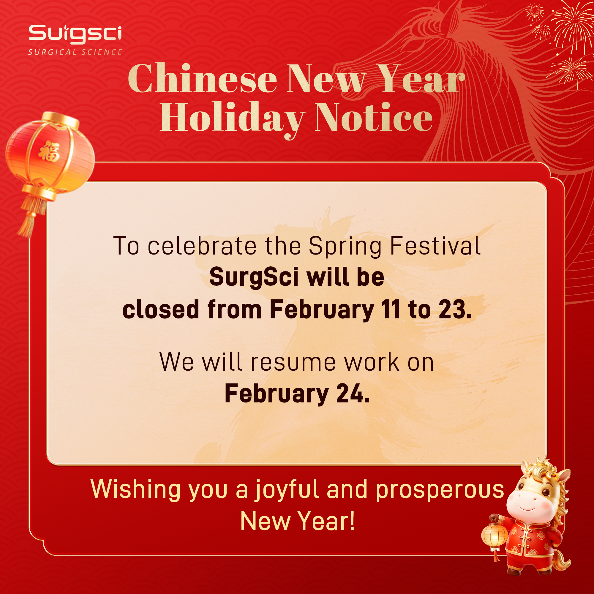 As the Chinese New Year approaches, SurgSci extends its warmest wishes to all partners, clients, and colleagues around the world. In celebration of the Spring Festival, the company will observe a holiday break from February 11 to 23, and will officially resume operations on February 24.
