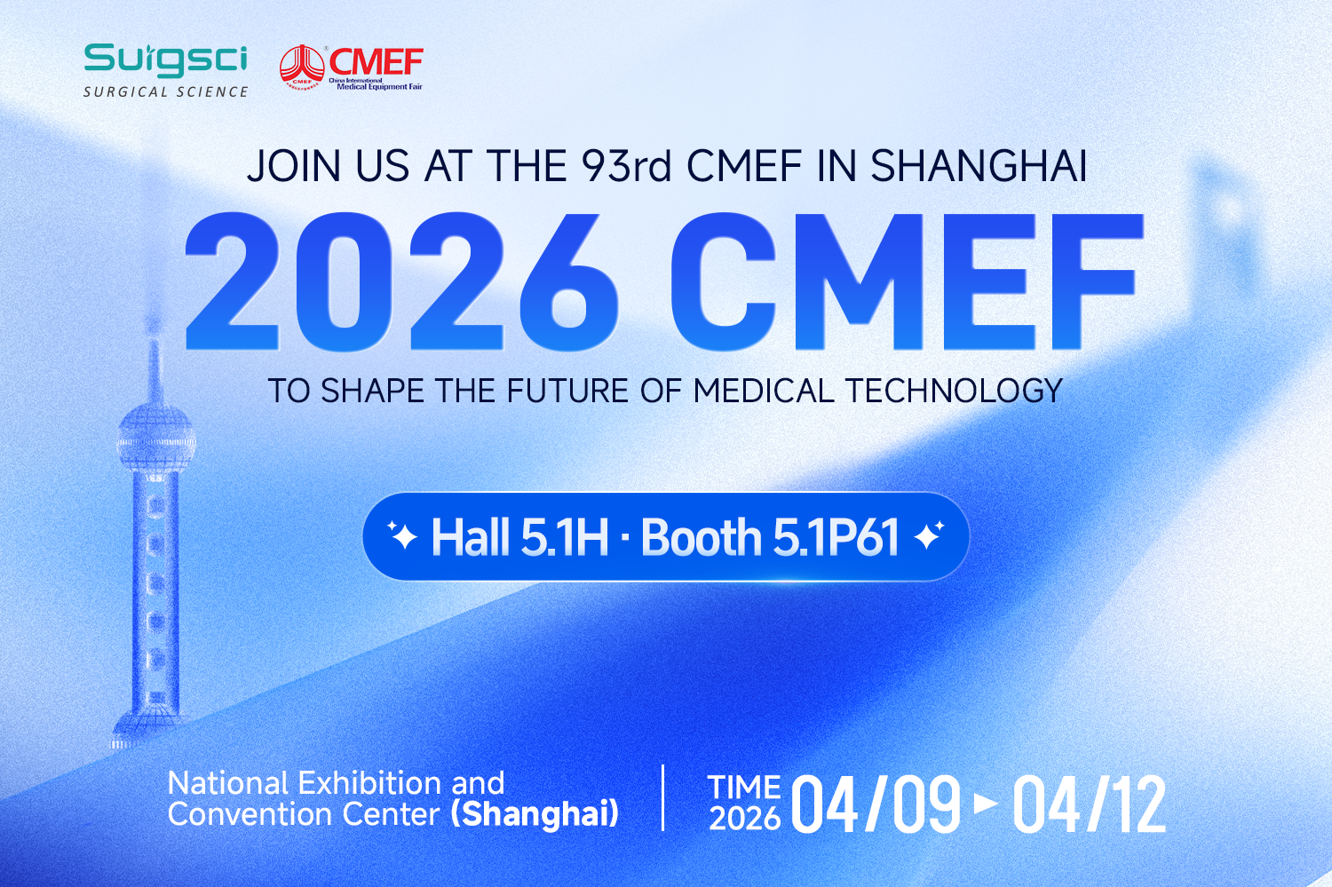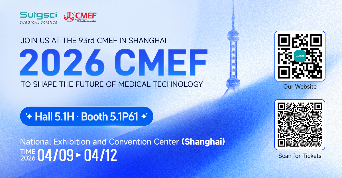 Surgsci will be participating in the 93rd China International Medical Equipment Fair (CMEF) from April 9 to 12, 2026, at the National Exhibition and Convention Center (Shanghai). We sincerely invite our partners, customers, and industry colleagues to visit us during the exhibition.